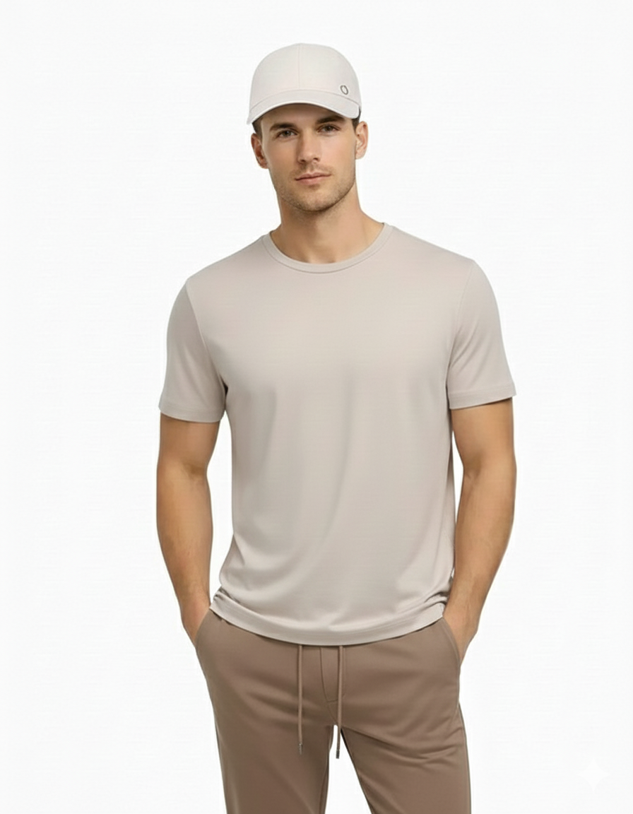 The OZBAY Soft Sand Cap is in a luxurious beige nude shade, a soft sand color that seamlessly matches any outfit. The minimalist black O-detail on the side provides a subtle, modern signature look.